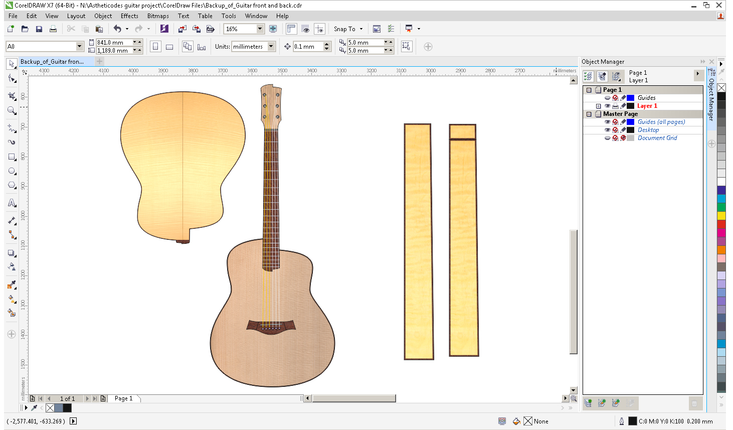 Even a master craftsman working with traditional materials eventually succumbs to the lure of the digital, and Nick gets stuck into some Computer Aided Design using Coraldraw to incorporate these various features into a precise specification of the shape and dimensions for our guitar. The next stage will be to work out where to locate our aestheticode patterns and to figure out what kinds of interactive services they might actually trigger ….