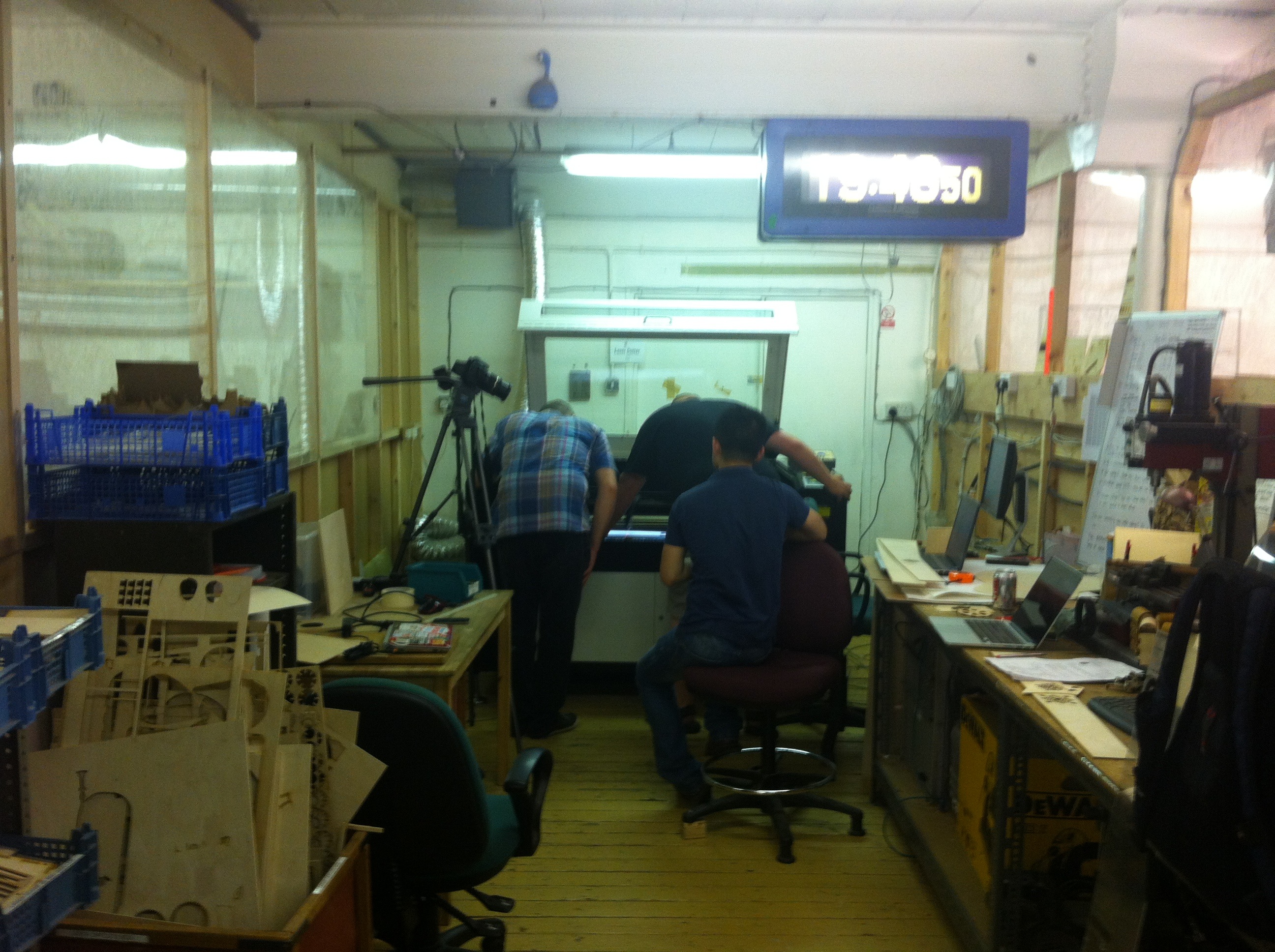 In the meantime, we’ve been back to Nottingham’s Nottinghack maker space to embark on our first ‘serious’ laser etching session, by which we mean our first attempt to apply an aestheticode pattern to an actual piece of flamed maple that will form part of the guitar, in this case the headstock . It’s an tense moment as we gather around the machine and hold our collective breath.