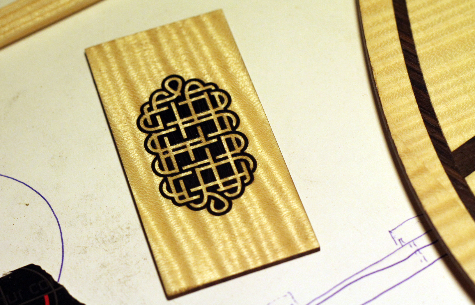 We etch Liz’s delicate knotwork into a small piece of flamed maple. Nick then carefully finishes it with Rosewood inlay…