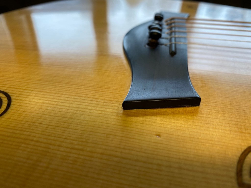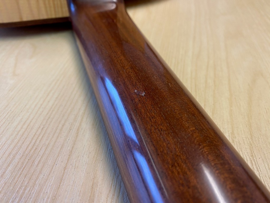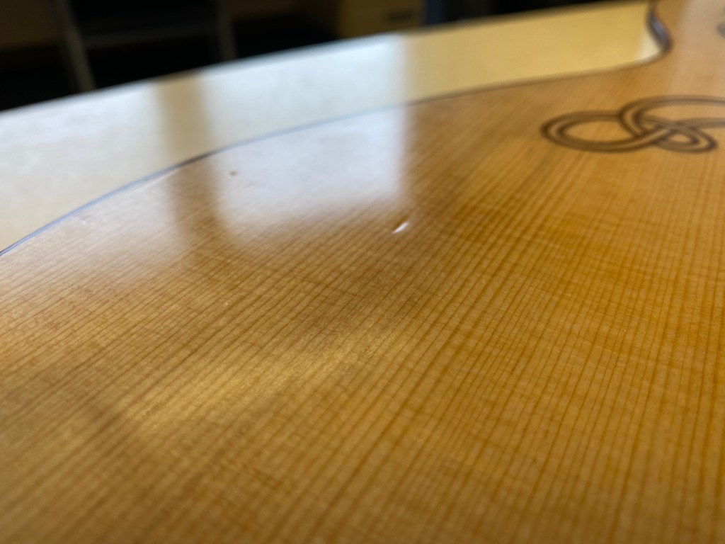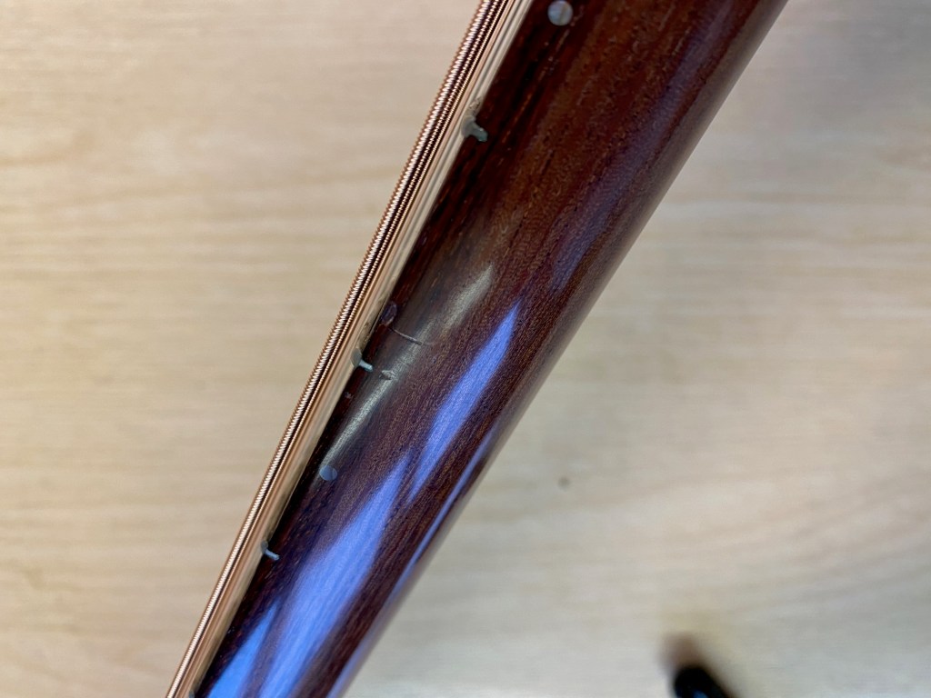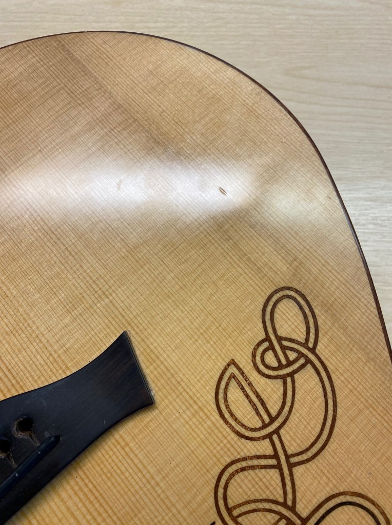 Like all physical objects, guitars acquire a patina over time; a distinctive pattern of wear and tear, and sometimes damage, that conveys their history. At five years of age, Carolan has already acquired some dinks and dents of its own and so we decide to give it a ‘once over’ with our camera to see what kind of a state it’s in. There are a few dents on the soundboard, while the bridge bears the scars of recent surgery (see Post 66), contributing to a somewhat wonky, but we think charming, toothy smile. While least immediately visible, the scratches and dink on the neck are the most noticeable to the player as they can be felt when fretting chords and notes. Finally, we’re surprised to encounter a hole in Carolan’s super hard Hiscox case suggesting that it has saved Carolan from some more serious damage at some point.