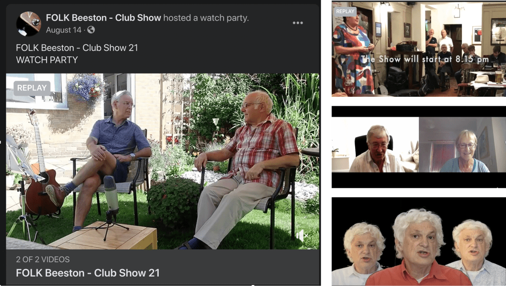 Like many cultural activities, traditional folk clubs have headed online during the global COVID pandemic. Our recent auto-ethnographic study revealed how two longstanding clubs around the Nottingham area approached this in different ways (Benford et al 2021). The Carrington Triangle club transferred its regular singaround format to Zoom as discussed back in Post 79. In contrast, Folk Beeston initially took to producing a weekly video show that members then watched together and chatted about in a live Facebook Watch party.