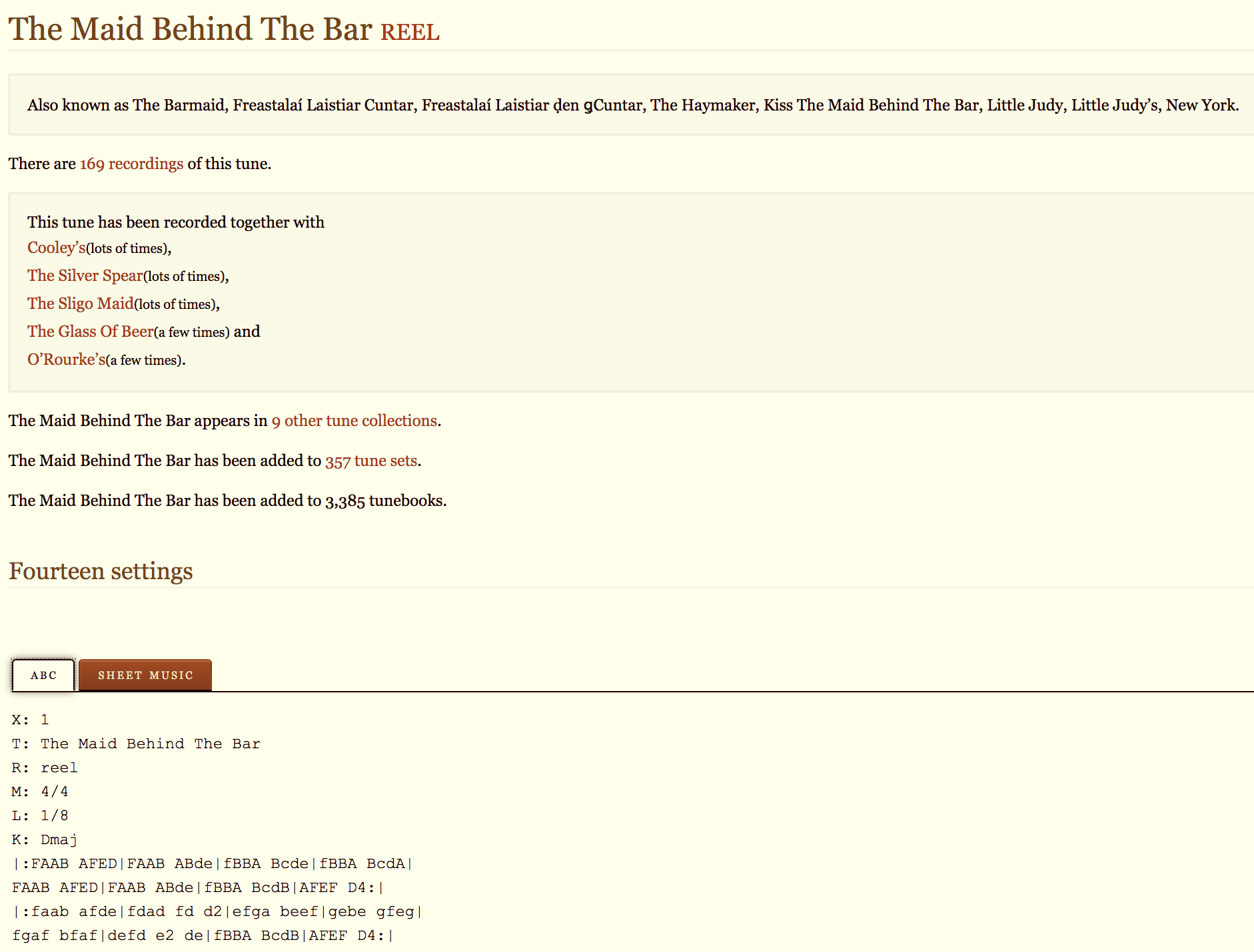Irish musicians were early adopters of the Internet, establishing a website called thesession.org in 2002 which has enabled them to crowdsource transcriptions and recordings of thousands of tunes, along with extensive notes about local variations, playing techniques and the times and locations of sessions across the globe. These transcriptions include the use of ‘ABC’ notation, a stripped-down shorthand musical notation used my traditional musicians suitable that captures just the basic essence of tunes.