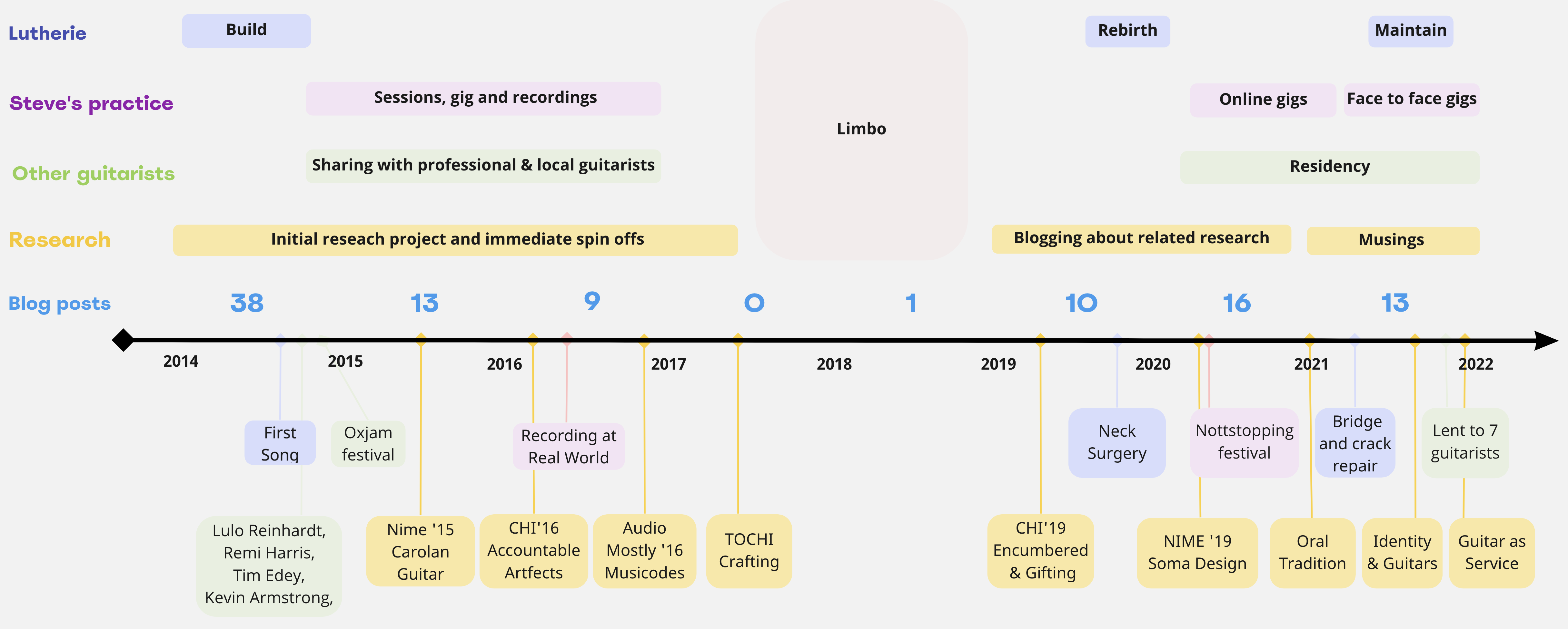 I’ve spent time revisiting our 99 blog posts to date and, in an attempt to bring some coherence to the story, ended up constructing a visualisation of four key threads of Carolan’s life: the lutherie of its making and maintenance; my own musical practice; sharing it with other players; and its parallel life as a research probe.