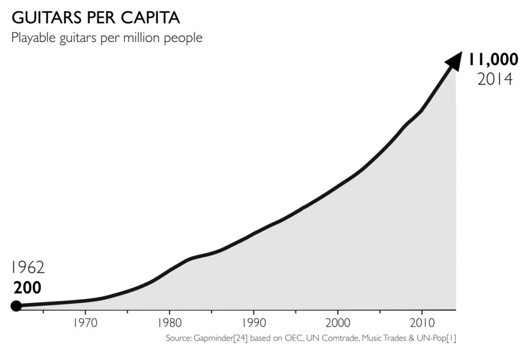 I was recently reading Hans, Ola and Ana Rosling’s Factfulness: Ten reasons We’re Wrong about the World and Why Things Are better Than You Think [2] and was delighted to encounter the following graph on page 64 (originally published by Gapminder [3]). As they write: “Culture and freedom, the goals of development, can be hard to measure, but guitars per capita is a good proxy. And boy has that improved. With beautiful statistics like these, how can anyone say the world was getting worse?”