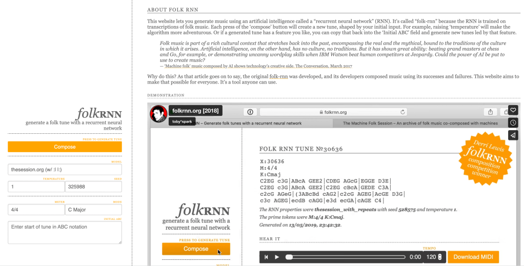 How does it work? FolkRNN employs a kind of Artificial Intelligence called Deep Learning that has become very popular over recent years as a way of training a computer to recognise patterns, perhaps most notably faces in images. Deep Learning uses neural networks to mimic aspects of the human brain. Digital structures called perceptrons model the brain’s neurons and are connected into layered network structures with feedback loops between them, and are then trained to recognise patterns from preselected training data. FolkRNN employs what is called recurrent neural network (hence its name), specifically a technique called long short term memory (or LSTM) networks. For those interested in the gory details, take a look at Bob and team’s paper [1].
